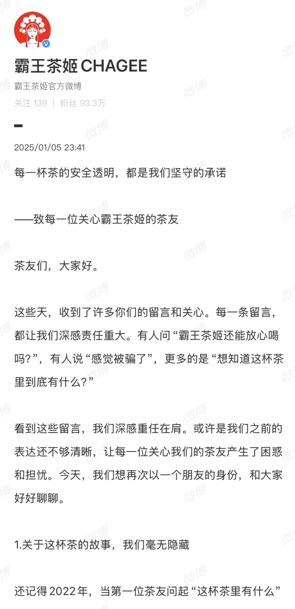 作为新茶饮代表,1月5日深夜,霸王茶姬在官方账号发布了主题为《每一杯茶的安全透明,都是我们坚守的承诺》的公告,通过问答形式解答了用户疑惑。