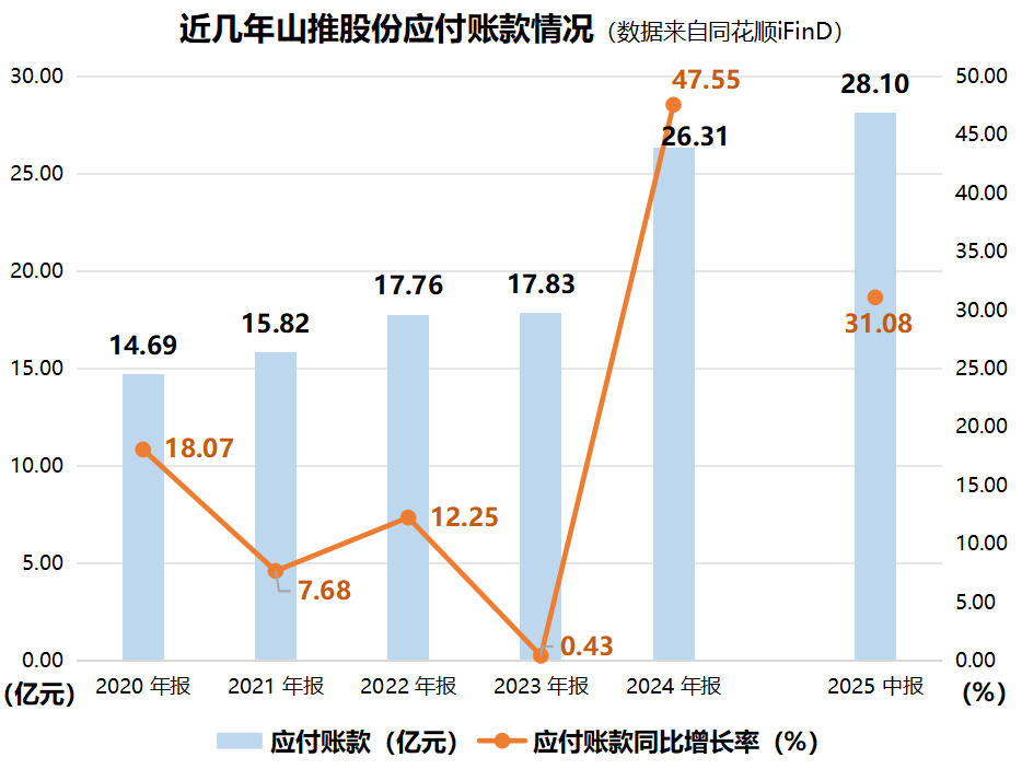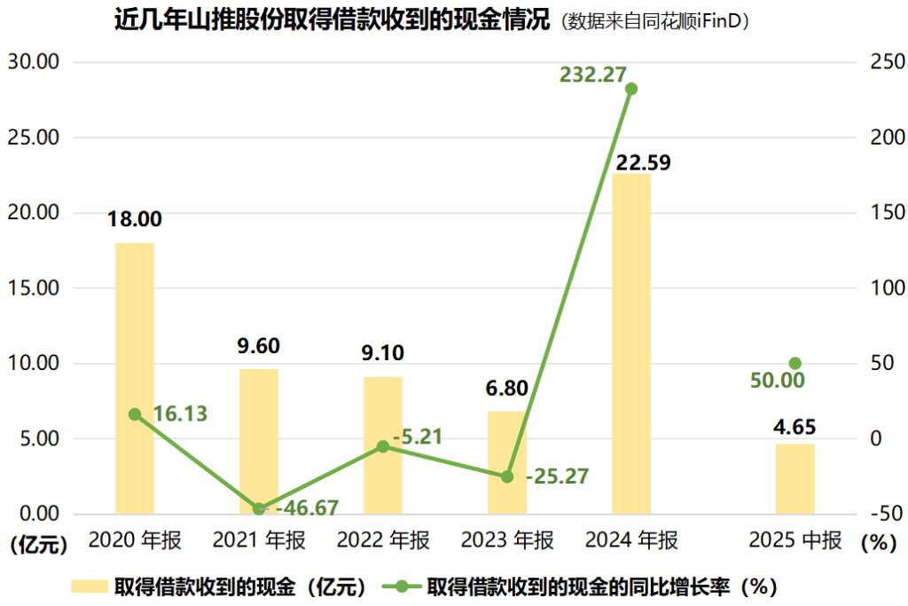 为缓解资金压力,自2024年以来,山推股份通过借款、延长供应商付款周期等方式加强资金管理。财报数据显示,2024年与2025年上半年,公司当期的应付账款余额均显著上升,同比增幅分别为58.54%与14.27%。同期,公司取得借款收到的现金也大幅增长,同比增幅分别为232.27%与50.00%。