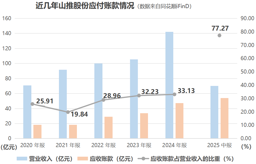 除收购山重建机带来的资金压力之外,山推股份自身应收账款高企的问题同样突出。2025年上半年,公司应收账款占营业收入的比重高达77.27%,意味着大部分销售成果未能及时转化为现金回笼,不仅占压了大量营运资金,也带来了潜在的坏账风险。