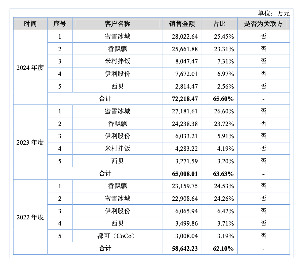 值得注意的是,客户集中度高是新天力面临的另一大核心风险。报告期各期,公司前五大客户销售占比分别为62.10%、63.63%和65.60%,呈现逐年上升趋势。其中,仅蜜雪冰城与香飘飘两家就贡献了约五成的收入。