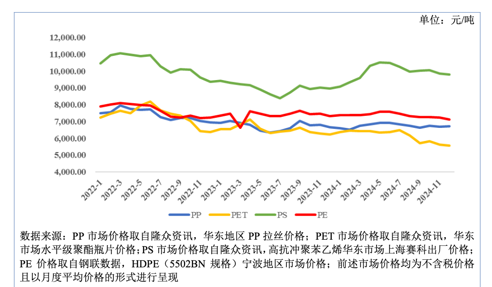 PP、PET、PS、PE 等大宗商品的市场参考价格变化情况