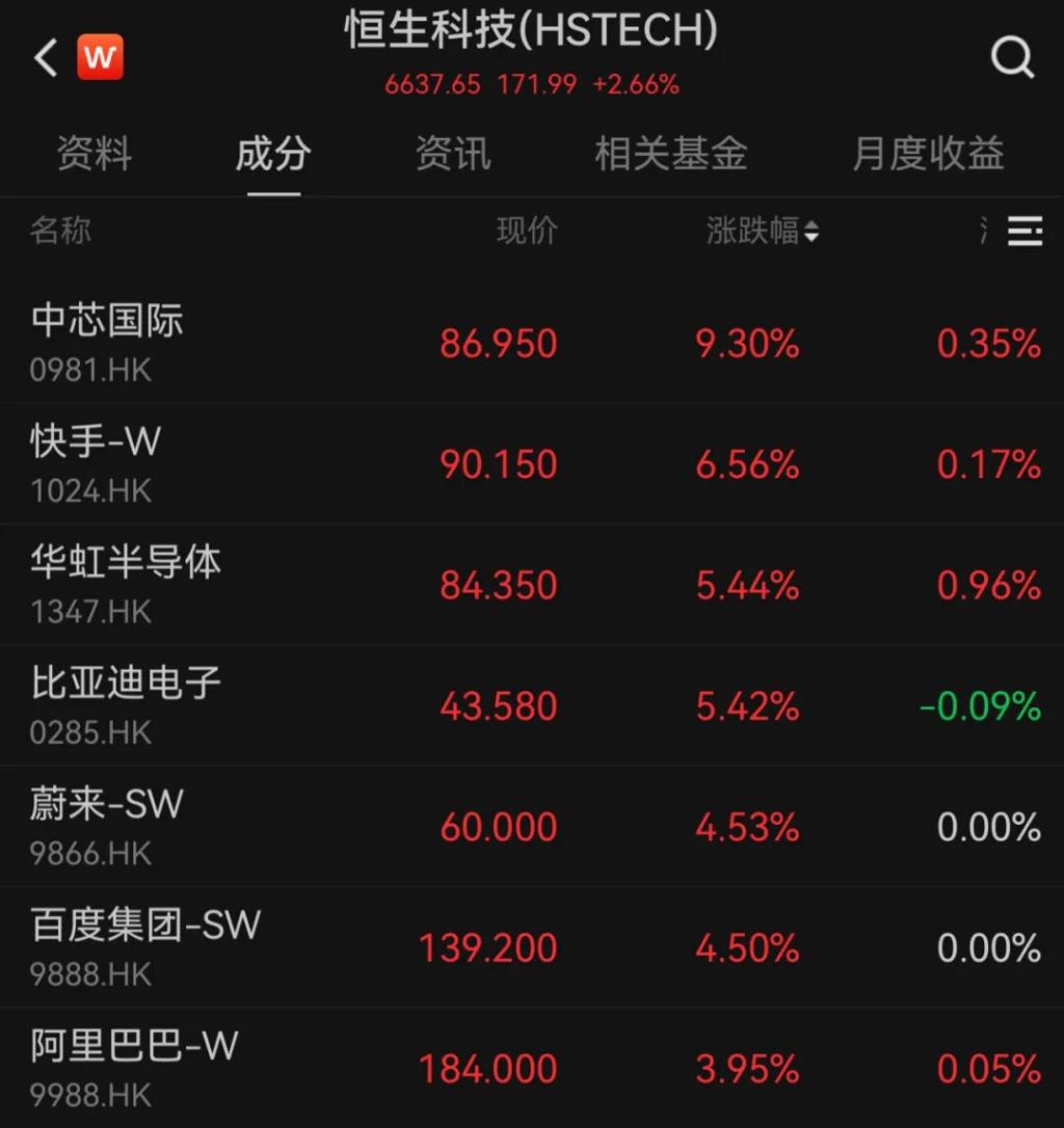 港股半导体概念股全线上涨,中芯国际涨超9%,华虹半导体、比亚迪电子均涨超5%。