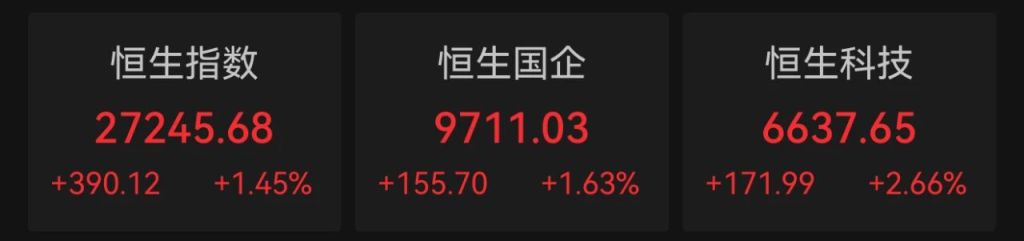 10月2日,港股迎来10月份第一个交易日,早盘港股高开后持续走高。截至午间收盘,恒生指数涨1.45%,报27245.68点;恒生科技指数涨2.66%,报6637.65点。