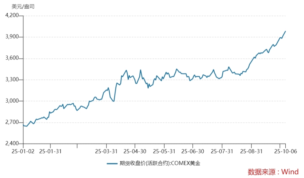9月23日,COMEX黄金期货价格首次突破3800美元/盎司,不断刷新历史新高。进入10月,国内假期期间,金价再上两个台阶,10月1日盘中站上3900美元/盎司,一周时间内,金价站上4000美元/盎司的历史高位。