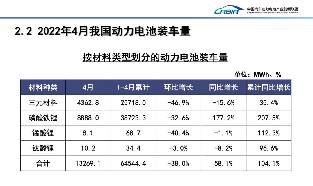 中国汽车动力电池产业创新联盟5月11日发布的最新数据显示,2022年4月,我国动力电池装车量13.3GWh,同比增长58.1%,环比下降38.0%。国内动力电池企业4月装车量的前五名分别为宁德时代、比亚迪、中创新航、国轩高科和欣旺达。其中,宁德时代单月装车量5.08GWh,占比38.28%。